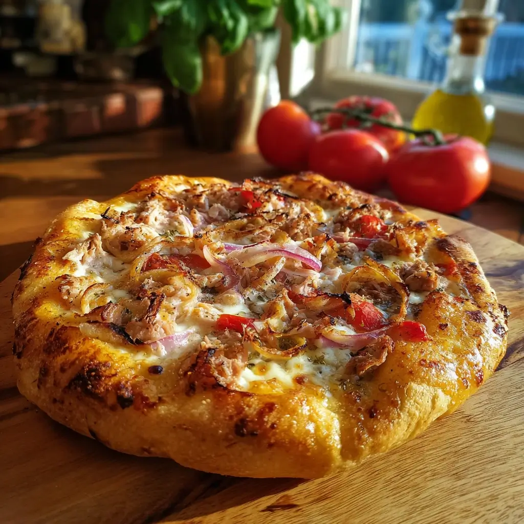 Thunfisch Pizza mit goldbraunem Teig, saftigem Thunfisch und geschmolzenem Käse auf einem Holzbrett.